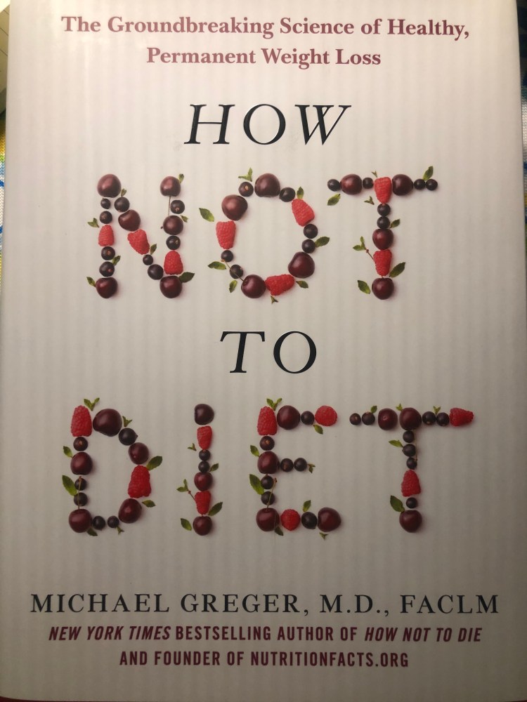 Just wanted to share an image of the book I’m using as my navigational guide to lowering those important numbers crucial to health: weight, waist measurement, blood pressure, cholesterol, and blood sugar. Since Dr. Greger promotes a plant based diet, note that the title is spelled out with assorted berries and not chicken nuggets and M & M’s.